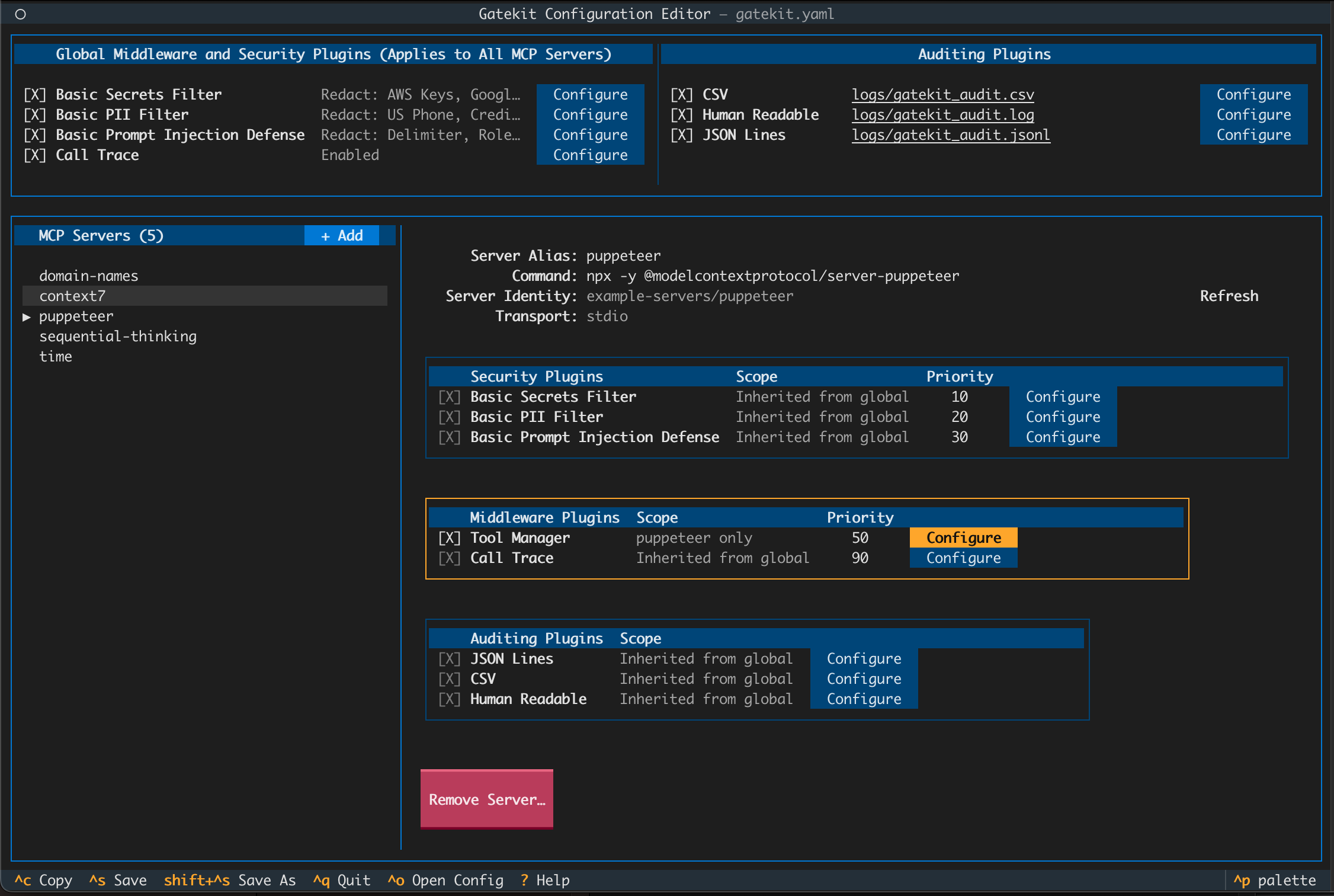 Run gatekit to launch the terminal UI. The guided setup wizard handles configuration for supported clients.